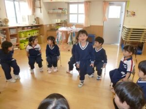 新しいお友だちを迎えて15名でスタートしたB組。今日はお部屋でゲーム遊びを行いました。ルールを説明すると『わかった!!』とニコニコ顔のB組さん、早速【猛獣狩りにいこう!】を始めました。動物の名前の文字と同じ数のお友だちと手をつないだら座ります。回を重ねると二人組・三人組・四人組と早くお友だちと手をつなげるようになっていきました。「カンガルー」の5文字は難しかったようです。その後も椅子取りゲームやフルーツバスケットを楽しみました。フルーツバスケットでは真ん中に立ちたくて誰も座らない現象も…また、ゲームしようね☆