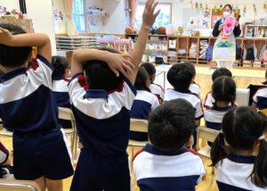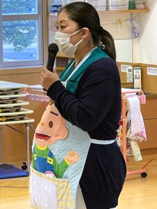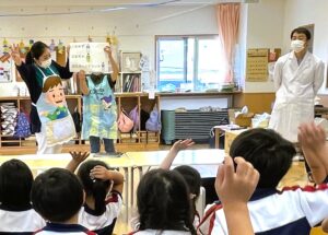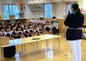星谷歯科医院の星谷先生に、一人ひとりお口の中をみていただいたあとは、恒例の【わくわく組*歯科講和】です。今日は、歯科衛生士の”のだちゃん”による<エプロンシアターとクイズ>。食い入るようにエプロンシアターをみて、クイズに答えるみんな。楽しかったね。