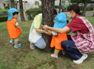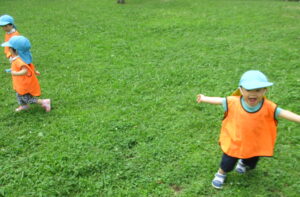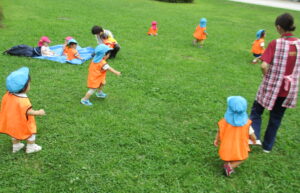 公園では蝶々を追いかけたり、かわいいお花を見つけたり、トンボを見つけて指をさしたり!様々な生き物や植物と触れ合いながら、お散歩を楽しみました。ブルーシートに座るお友だちは、「波だー!」とシートをバタバタさせてまるで海に入った気分♪ お外をふく風がとても気持ちよく、梅雨の晴れ間に思い切り体を動かすことができました。