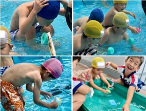 ストロー、スポンジ、ネットなどを使って、ヨットやおさかなを作ったあとは、それらを使ってのプールあそびを楽しみます。