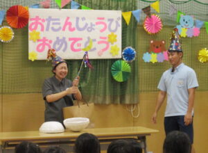 7/12(金)【全クラス】7月おたんじょうかい♪ 2024/07/12 昨日は7月のお誕生会を行いました。今月は8名のお友だちが1つ大きくなります。緊張しながらも、名前や年齢を上手に発表することができ、嬉しくて楽しい誕生会になりました。 ☆お誕生日おめでとう!素敵な1年になりますように☆ ▼ドキドキ・わくわく♪ 楽しみだなぁ~! ▼『好きなジュースは何ですか?』 ▼今月のマジックは成功したでしょうか?お友だちに聞いてみて下さいね! ぽかぽか 大竹