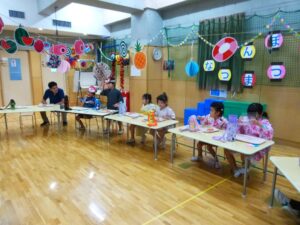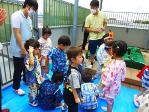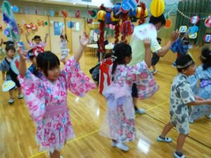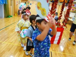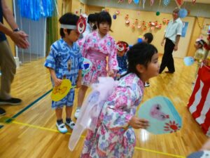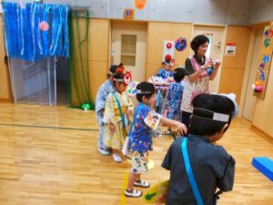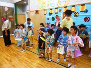 このところ風鈴やうちわの制作、盆踊りの練習に気分を盛り上げていたA組さん。今日はなつまつりにむけた衣装に身を包み、少し照れた笑顔♪ 慶應大学のボランティアさん、実習中の学生さんも一緒で、うれしさも倍!!