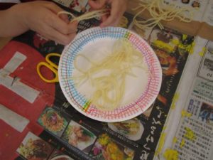 毛糸をはさみで切り、お皿に盛り付けていきました。