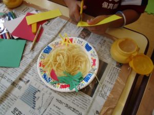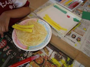 冷やし中華と言っても、本物ではなく毛糸と画用紙で作ったものですが、子どもたちは「本当にお料理してるみたい!」と大興奮!