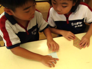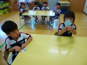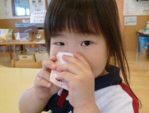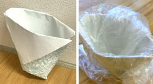 そこで、今日のわくわくさん。みんなができることを考え、避難時にすぐに作れて役立ちそうな【紙の手作りコップ】を作ってみることに。もちろんこのままでも良いのですが、ビニール袋をかぶせれば何度でも使えます。