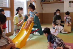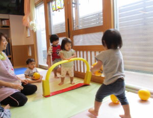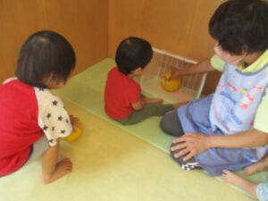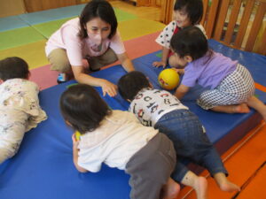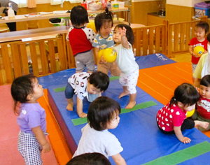 それでも元気いっぱいのぽかぽか組!!今日はお部屋で運動遊びを行いました。運動会でも披露したマットのトランポリンや滑り台、みんな大好きなボールを使って体をいっぱい動かしました!!