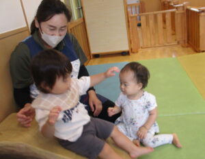 マットのトランポリン。運動会では緊張気味な様子だったお友だちも、今日は毎日過ごしているお部屋だったせいか、ジャンプしたり足踏みしたりとリラックスして楽しむ様子が見られましたよ。