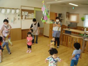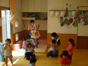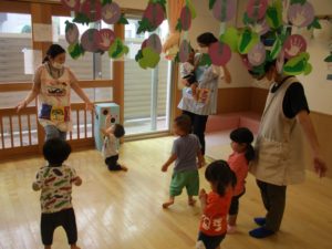 順番に保育者と触れ合いながら、一緒にジャンプしたり、ゆらゆら揺れたり、楽しみました。