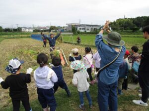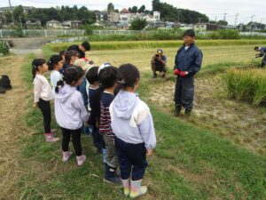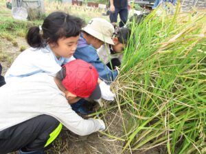 昨日『稲刈りの練習』をしたり『おにぎりの具は何が好き?のお話』をし、楽しみな気持ちで今日を迎えたみんな。二人一組になり一人が稲を持つ係、もう一人がはさみで切る係に分かれ協力して行い、収穫できたときのみんなの笑顔がとても素敵でした。