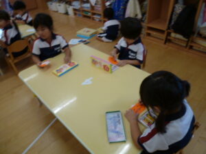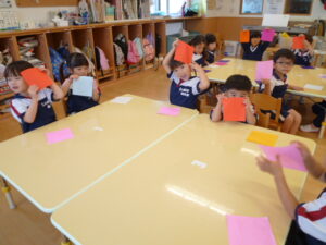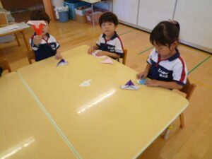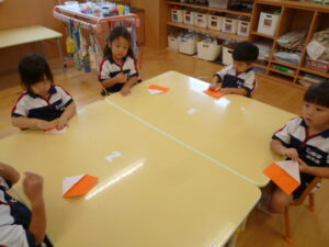 朝晩涼しくなりやっと秋らしい陽気になり、街にはハロウィンの飾りも増えてきました。園ではハロウィンのイベントなどは行いませんが、お部屋を飾り付けようと折り紙制作をしました。