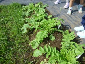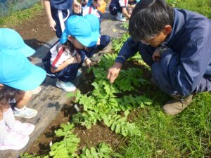 今回の活動は大根の間引き。元気のよい一つだけを残し、他の芽は抜く作業です。前回の雑草とりで大根の芽も抜いてしまったB組さん。なので、今日の間引きはゆう先生におまかせして、みんなはじっくり観察です。