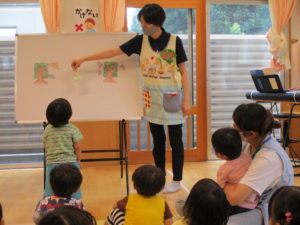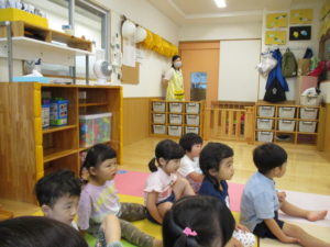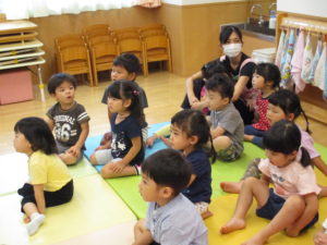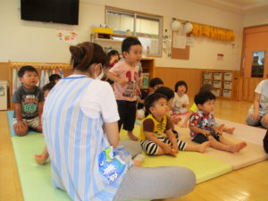 今日は、1歳児クラスのみんなが遊びに来ました。