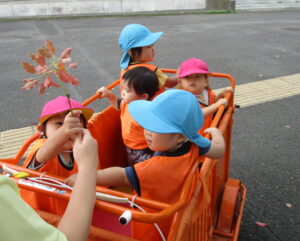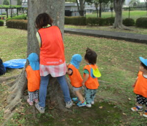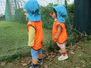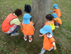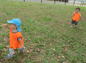 大きな木や葉っぱがたくさん落ちている広場へ向かいます。「とんぼさんいるかな~」「ちょうちょはとんでいるかな~」と期待を膨らませるお友だち。広場へ向かう道中で、早速秋を象徴とさせる赤い葉っぱを発見!目を輝かせて見つめていました☆