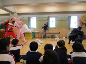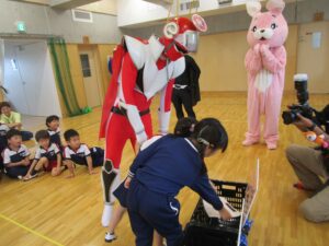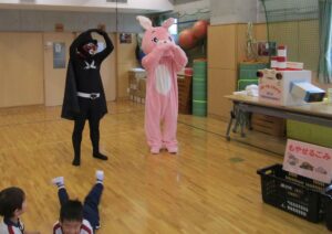 ▼正義の味方『リサイクルレッド』『うさちゃん』、そしてA組さん、みんなで力を合わせ「リサイクルビーム!!!」『ポイ捨て男爵』は改心し、捨てたごみをきれいに拾ってくれました!