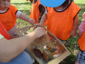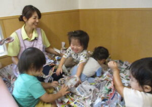 10月に入り、秋の制作を楽しんでいるぽかぽか組のお友だち。お散歩で集めた落ち葉や、大好きな新聞紙遊びで作った制作を紹介します。