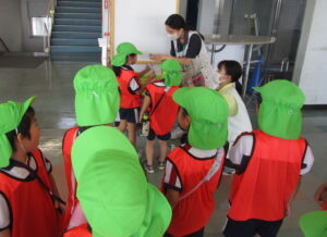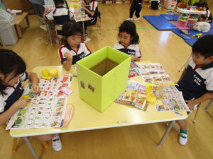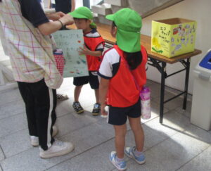 保育園を代表し、A組さんが湘南台自校さん・文体さんに『箱+ポスター』をお届け!