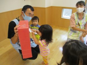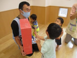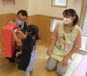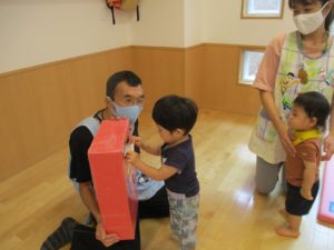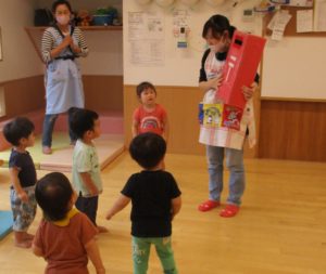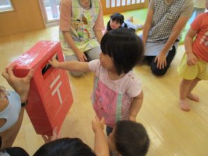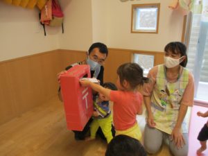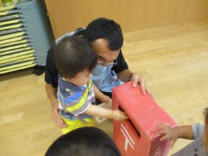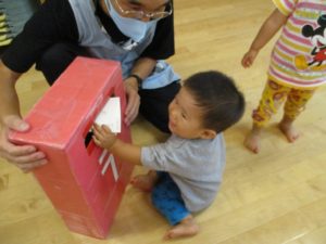 保育者が、『ハガキが大好きで、ムシャムシャ食べると大好きなじいじ、ばあばの所におハガキ届けてくれるよ!』
