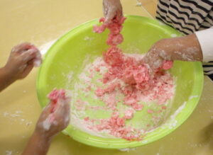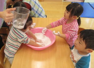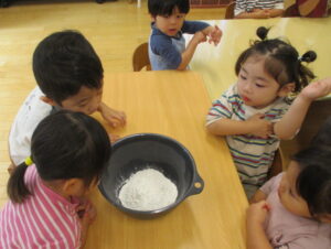 前回大人気だった『米粉ねんど』を今日はイチからみんなで作ってあそびました。米粉自体に初めて触れるお友だちのために、以下の手順でゆっくりと作ります。