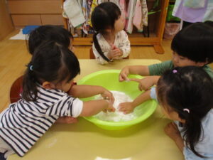 お互いがよく見えるように「こっちおいで~」と声を掛けあったり、手が白くなって驚くお友だちに「こうやると落ちるよ」と手をすり合わせて見せたりと、やさしさあふれる関わりあいもみられました♪