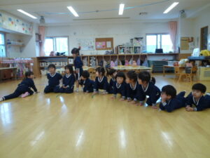 お部屋で活動。B組さんのお部屋も借りて『だるまさんがころんだ』をしました。猫になって近づき、捕まった仲間を助けようとしますが、みんな捕まってしまいました。