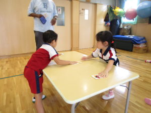 アイゼア先生の後に続いて唄ったり、単語カードを友達と競って取ったり、今日も楽しく過ごしました。
