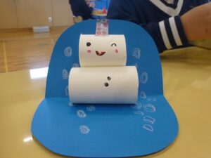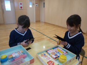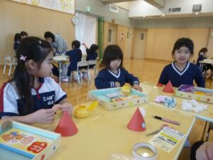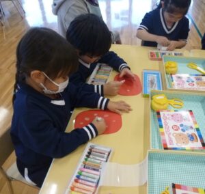 ホールに流れるクリスマスソング♪ 作りたいものを選び、ワークショップ<スタート> 1つ目はC組さんでも簡単にできる『雪だるま』。2つ目は『サンタクロース』~AB組さんはサンタの顔のマルを自分で切って描きます。3つ目はハサミを使って『ステンドグラフ』作り。ハサミを使うときの注意を守りながら、C組さんも挑戦です。作った作品は園のクリスマスツリーに飾ったり、持ち帰り希望のお友だちが持ち帰りますので、お家で飾って下さいね。