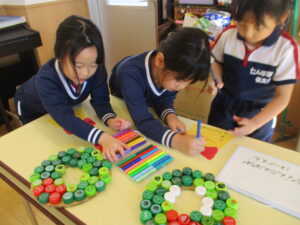 ▼ちょっとしたキャップアート♪ メッセージを添えてA組さんと一緒に作りました!