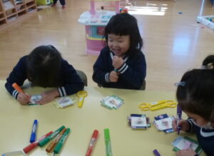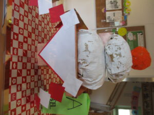 新しい年を迎えたらみんなで楽しもうと作っていたコマや羽子板などのお正月あそび。今年に入ってからも引き続き楽しんで制作しています。『お正月あそびって何がある?』というところから、『自分は何を作りたいか、何で遊びたいか』を考え活動を進めています。
