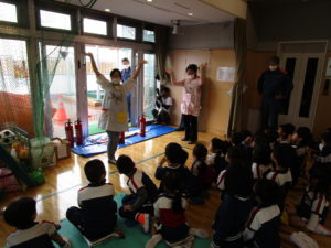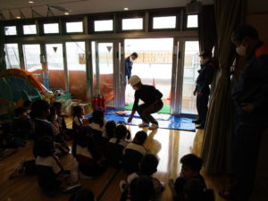 消防隊の皆さんから消火器の使い方の説明を聞いた後、