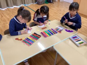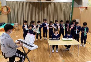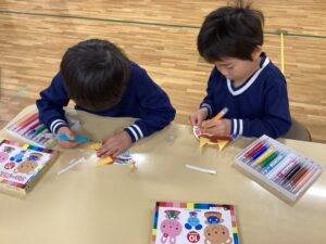 交流会では鬼のお面を一緒に作り、『まめまき』の歌をお面をつけながら歌いました。最後は生活発表会で演奏した『メリーさんのひつじ』を鍵盤ハーモニカで弾き、たくさん褒めていただきました。