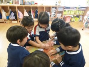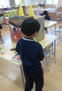B組さんに『節分の由来』のお話をしていると、「自分の中の悪い心を退治したい!」というお友だちの声が聞こえてきました。しかし「豆を自分に当てるのもお友だちに当てるのも痛そうでできない…どうしよう?」と、話し合うみんな。