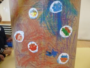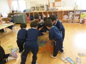 そこで、「みんなの心の鬼を集めた大きな鬼を作ろう!」と盛り上がり、製作がスタートしました。(本当は担任としては鬼のお面作りに話を持っていきたかったのですが…)