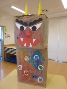ぽかぽかさんのお部屋の前に置いてあった絵本『まめまき ぱーらぱら』を読んだことでイメージがふくらみ、さまざまな鬼を思い描きながら作り進めるB組さん。色とりどりのカラフルな鬼が完成しました。
