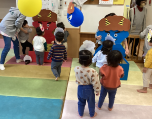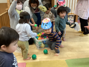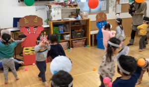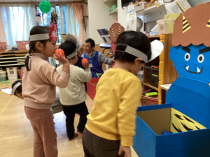 昨日は、お家で節分パーティーを楽しんだお友だちもたくさんいましたね。そして今日は、保育園での節分あそびの日!例年みんなで集まって節分集会ですが、今年からは乳児と幼児に分かれて楽しみました。