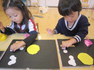 円を切るのは少し難しかったのですが、自分で切ったお月様を嬉しそうに眺めていました。
