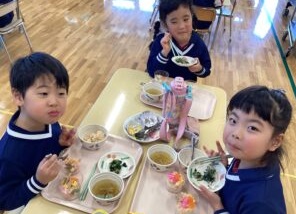 今日はひなまつりにちなんで、AB組のお友だちと一緒にカップちらし寿司を作りました!