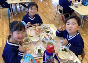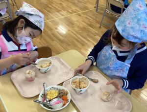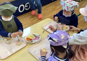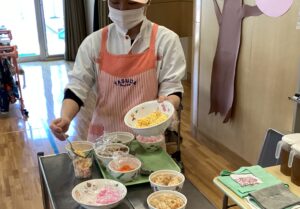 色とりどりの具材を自分の好きなようにカップに詰めて、オリジナルちらし寿司が完成!!みんな「どれを入れようかな?」「きれいにできたよ!」と楽しみながらクッキングしていました。