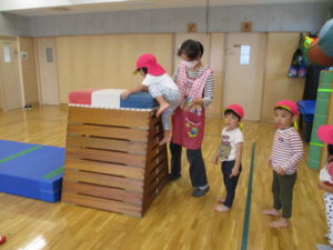 保育者の手伝いをほとんど借りずに、登ってジャンプ!