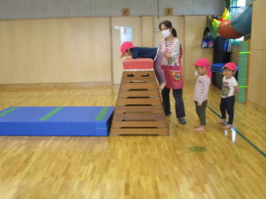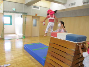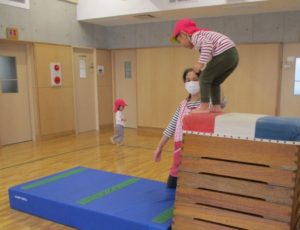 お友だちよりも大きな跳び箱によじ登りジャンプ!