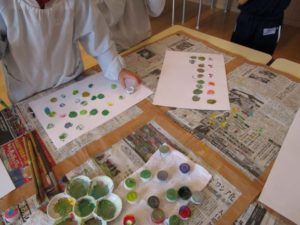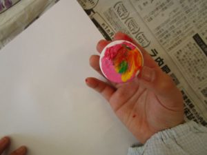 今日はエコキャップを使ってスタンプ遊びをしました。