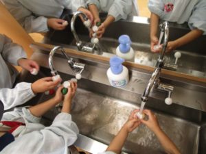 その後、「エコキャップでこんな遊びもできるんだね」とお話しながら絵具で汚れたキャップを綺麗にしました。