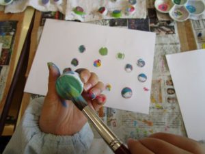 いろいろな方法で白い画用紙にたくさんの水玉模様を作りました。