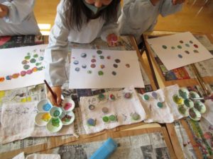 パレットに出された赤、ピンク、水色、黄色、黄緑、緑、白の絵具を自由にエコキャップに塗り、どんな色の水玉模様ができるかみんなで楽しみました。