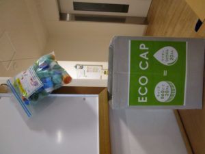 そして世界中の子どもたちにワクチンが届きますようにと願いを込めてエコキャップ回収ボックスへ!