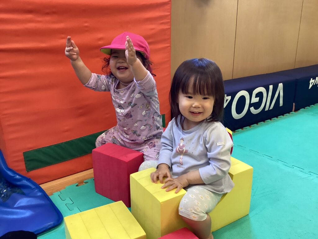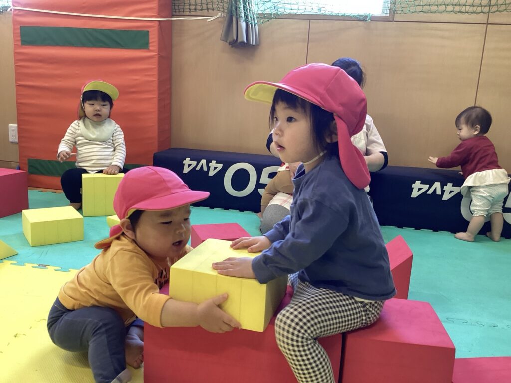 大型ソフトブロックではお山作りをしたり、ブロックを並べて両手でバランスを取りながら遊びました。エバーマットでは思うがままにジャンプをしていました。マットの敷いてないところでは追いかけっこ!保育者が子どもたちを追いかけると、キャッキャッとたくさんの笑い声が聞こえてきて、とても楽しい時間を過ごしました。