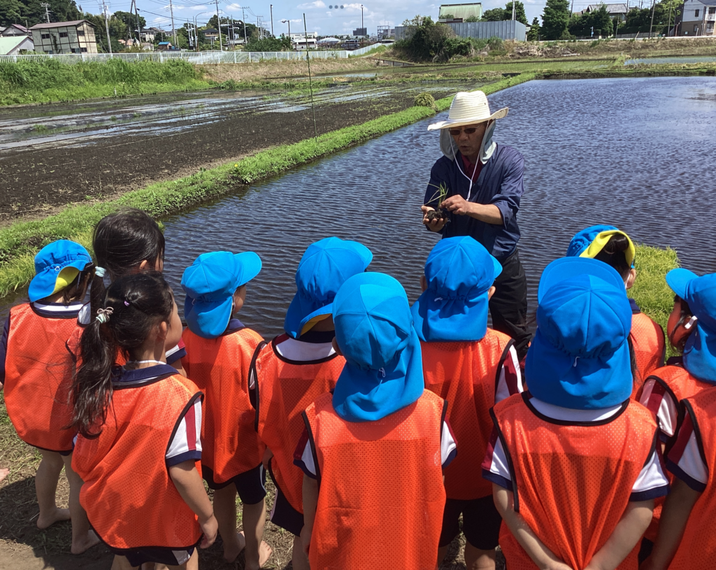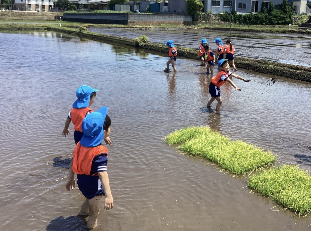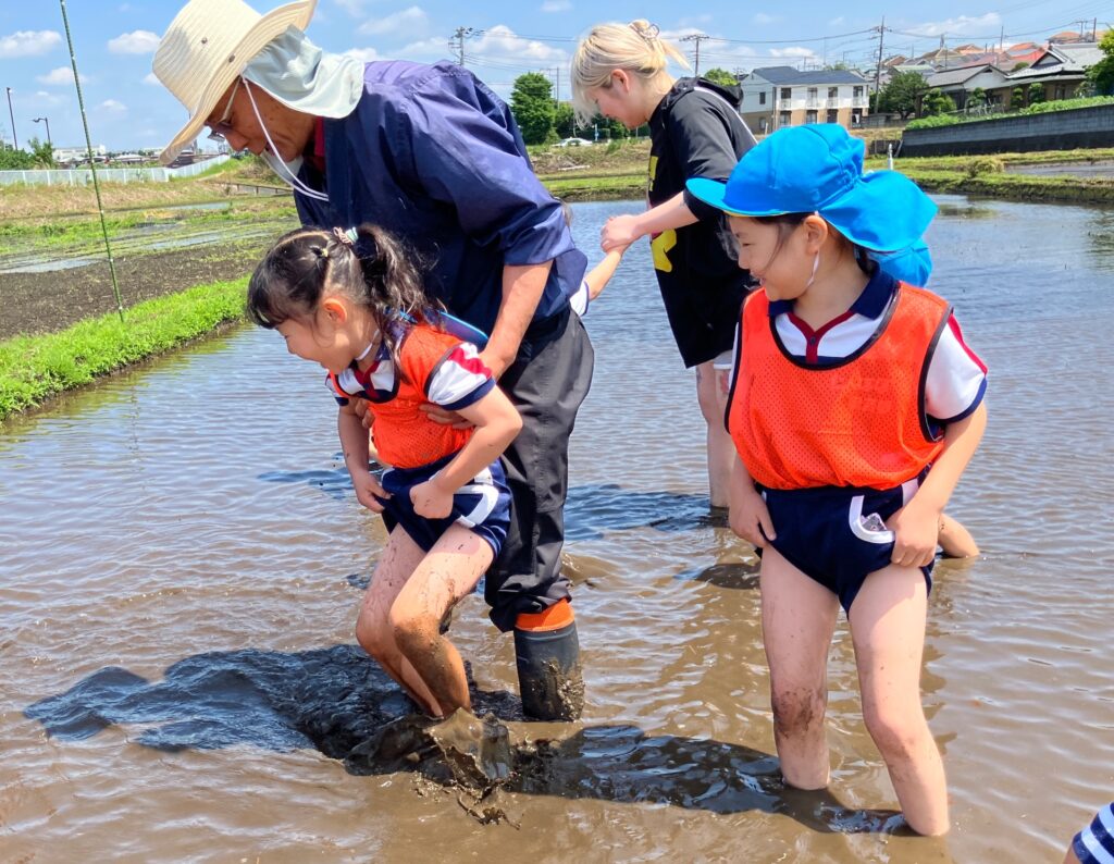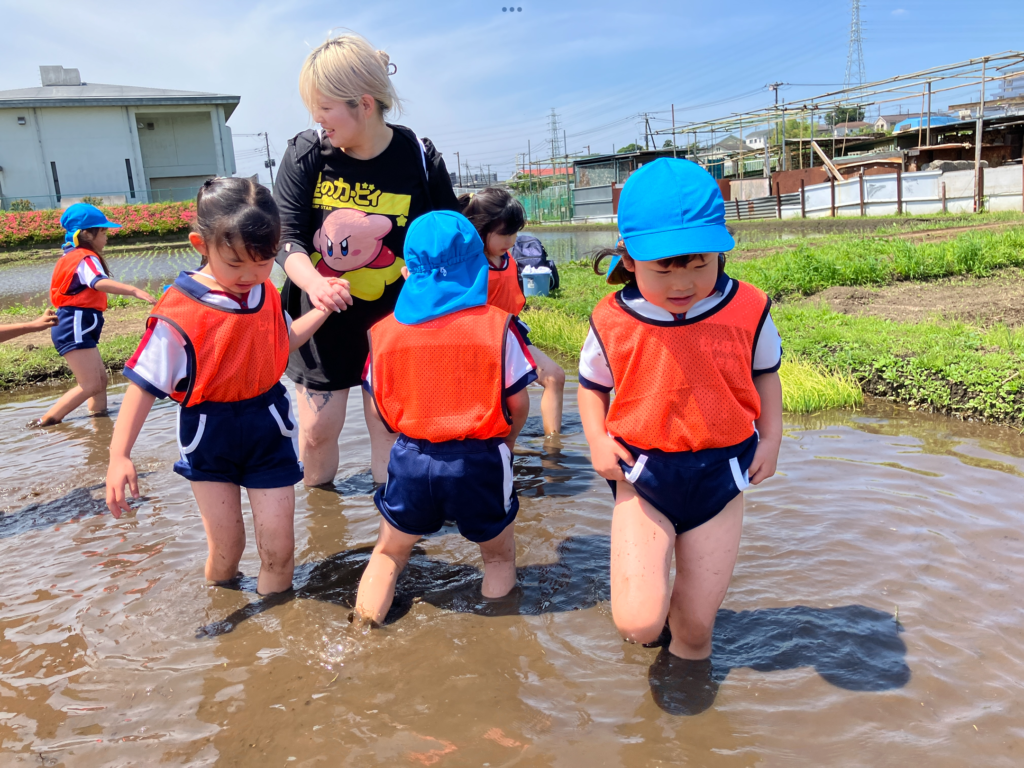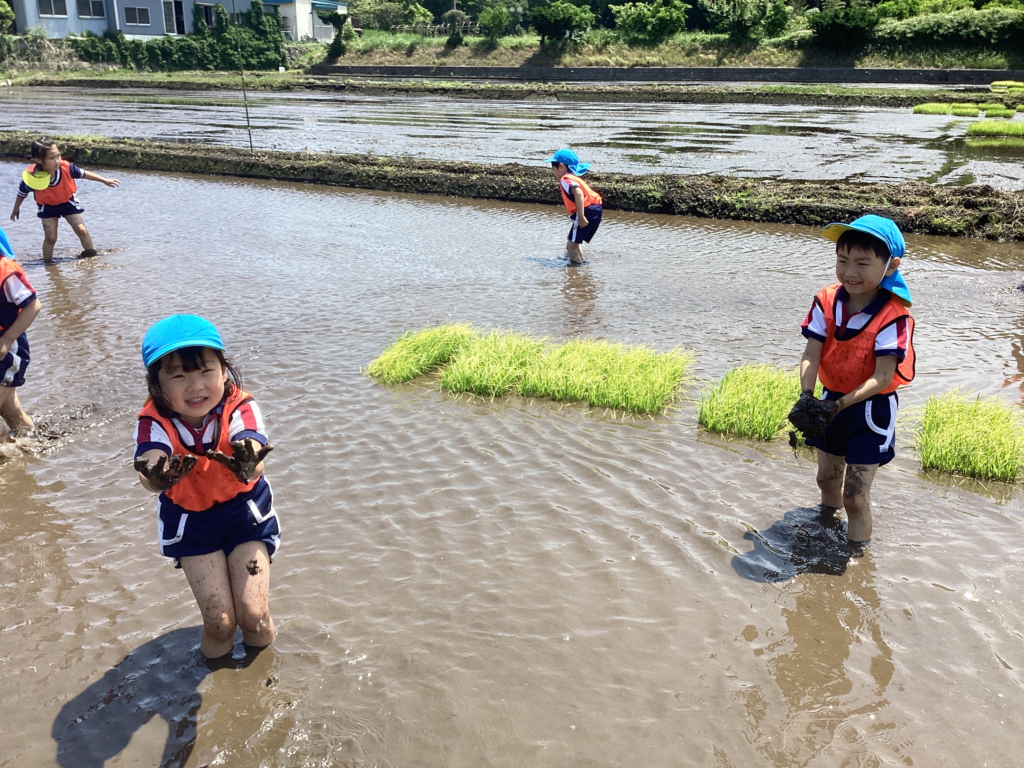はじめは代掻きに対して、「どろにはいるの・・?」「よごれるよ・・」と消極的だったお友だち。足だけ入ることになり、洋服は汚れずに済むね!なんて話していましたが、いざ田んぼに入ると楽しくて楽しくて仕方がないみんな!!気が付くと、腕も顔も体操服も見事に泥でいっぱいになりました。予定より短い時間で控えめな代掻きになってしまい、残念な気持ちもありますが、それでも子どもたちはたくさん楽しんでくれて嬉しかったです!!来週は《田植え》があります。お天気に不安は残りますが、無事実施できるよう願っております!!