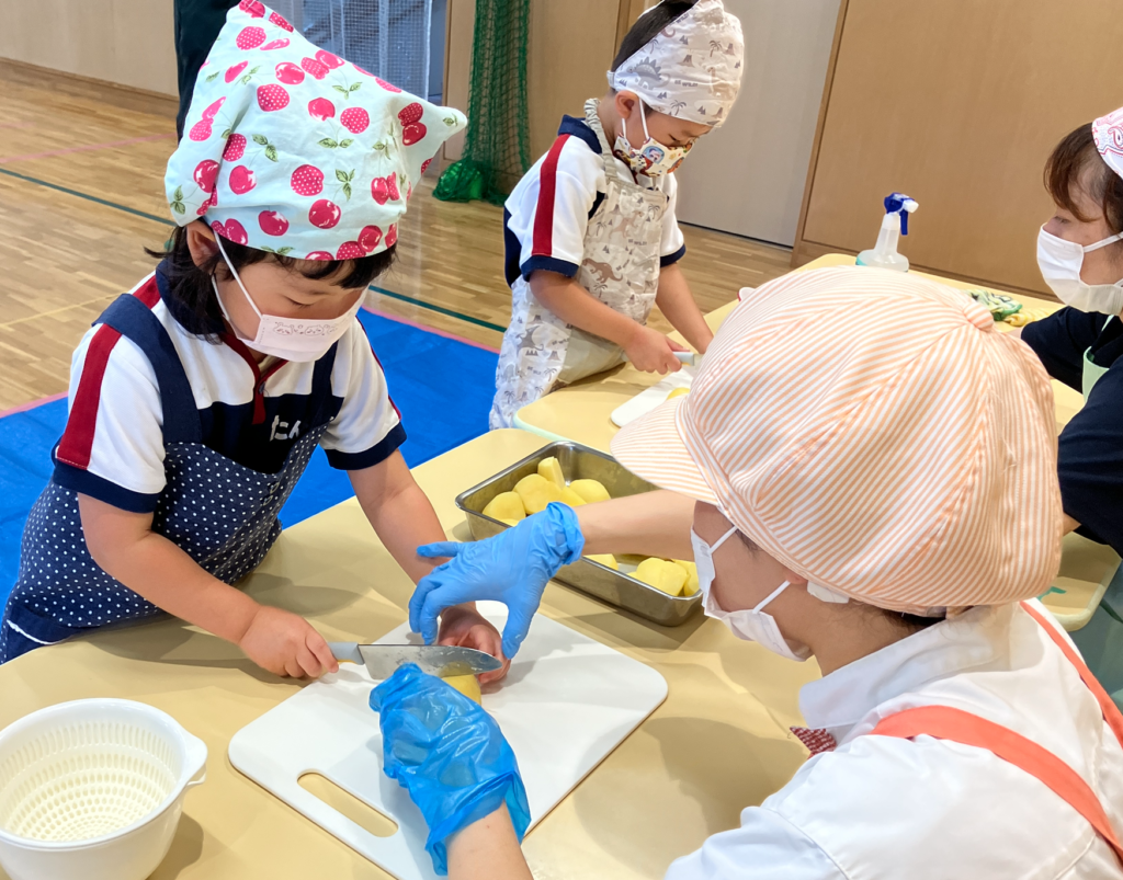 A組さんは包丁にチャレンジしました。猫の手でじゃがいもをカットします。真剣なまなざしはとってもかっこよかったです。