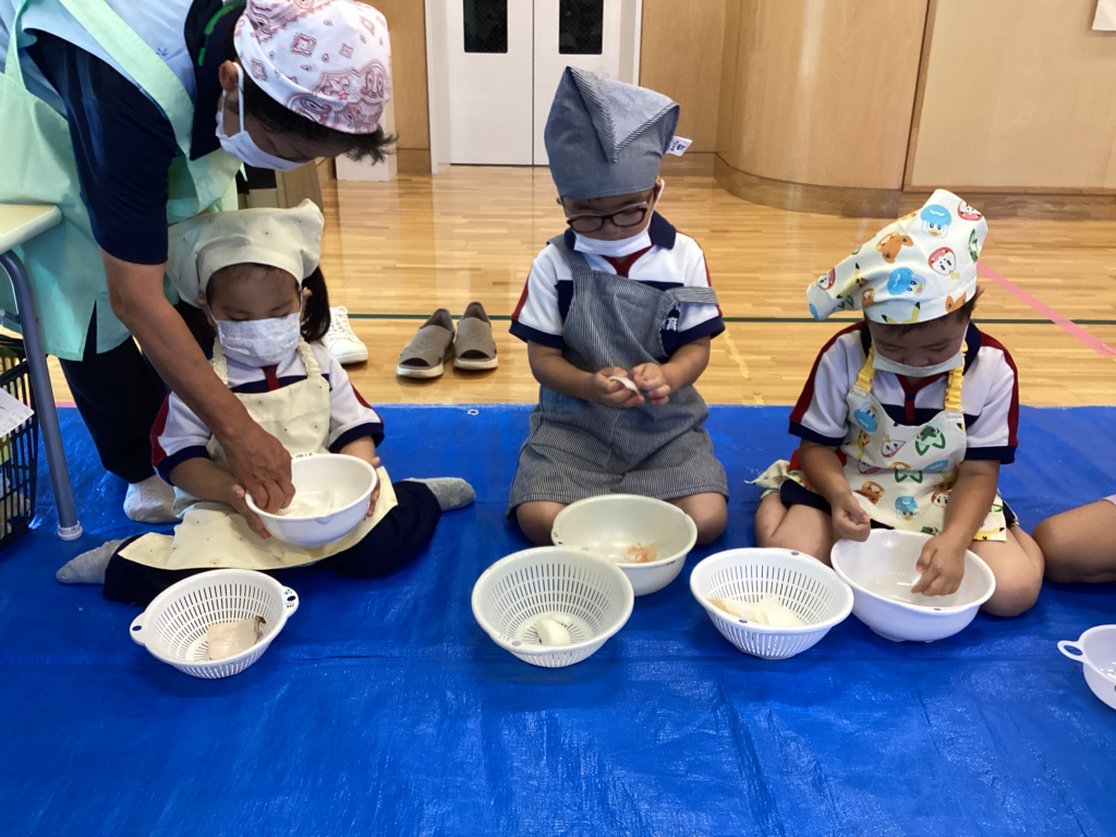 B組さんはたまねぎちぎりチャレンジ!みんなで輪になって楽しくちぎりました♪昨年たまねぎちぎりを担当したA組さん。「なみだでなかった~?」とB組さんを心配する優しいお友だちでした♡