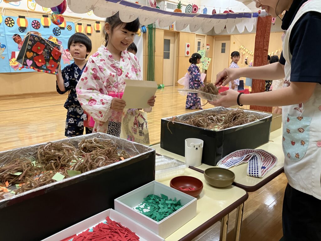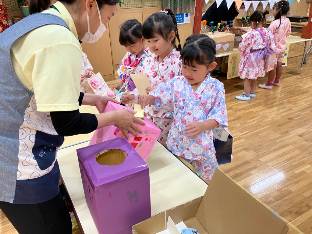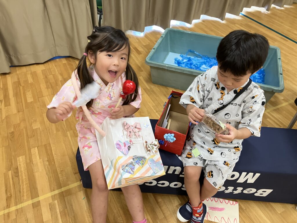 朝から甚平や浴衣で登園したA組さんは、先生や小さいお友だちから「かわいい〜!」とたくさん声をかけられ、ちょっぴり照れながらも嬉しそうな表情♡