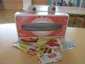 今日使ったのはおいしい物がいっぱいのったチラシと、ティッシュの空き箱!
